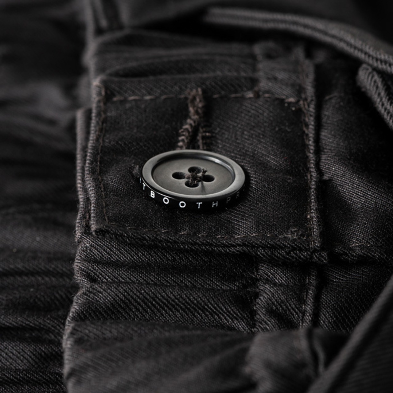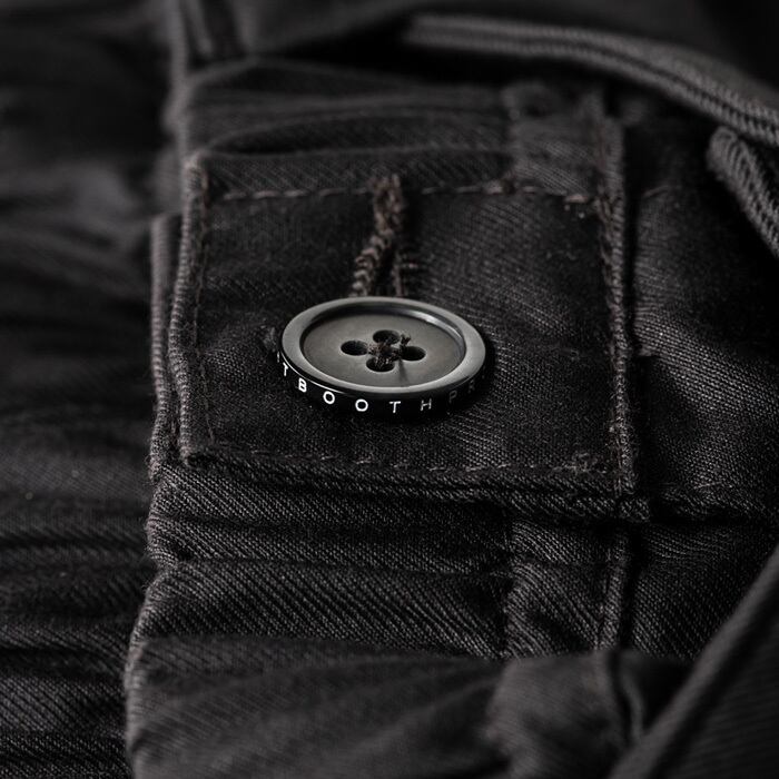 バックの右腰部分にはロゴ入りのヌバック風パッチ付きで、ボタンもロゴ入りのものを使用。
