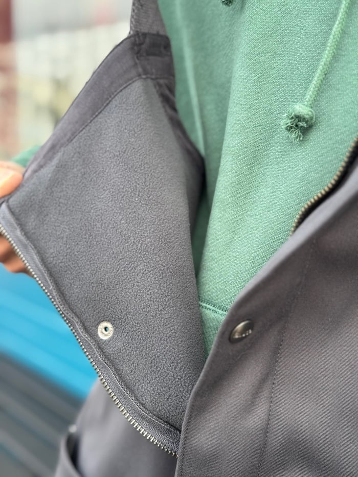 フリースをボンディングしたストレッチT/Cツイル生地で、冬場でも快適な着用感を実現。