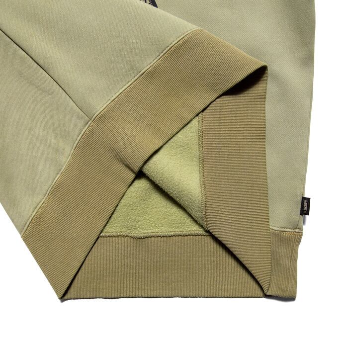 ボディはコットン100%の裏毛生地にピグメントダイ加工を施し、時間が経つほどに風合いが増すエイジングも楽しめる仕様。