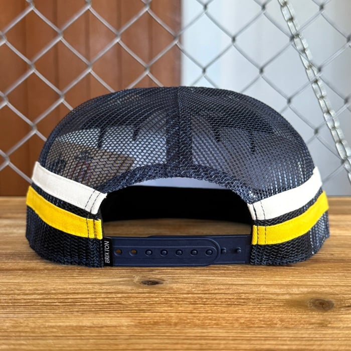 ネイビーのボディにイエローの刺繍と、メッシュ部分に配されたストライプパネルが絶妙なコントラストを生んでいます。
