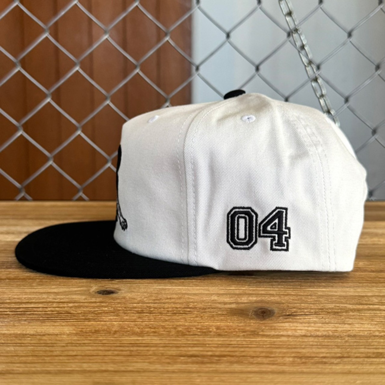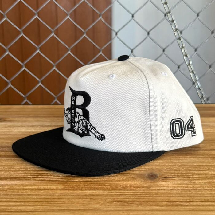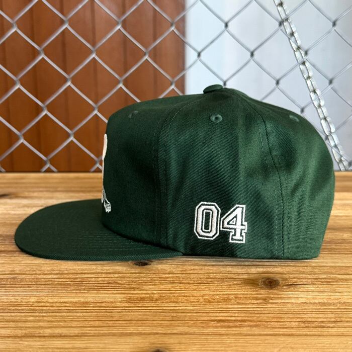 フロントとサイドに刺繍が施された5パネルでフラットブリムのキャップです。