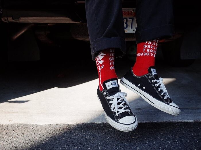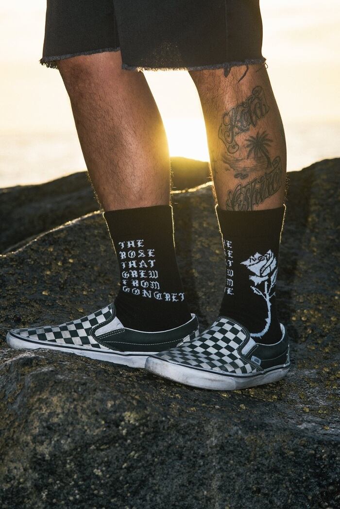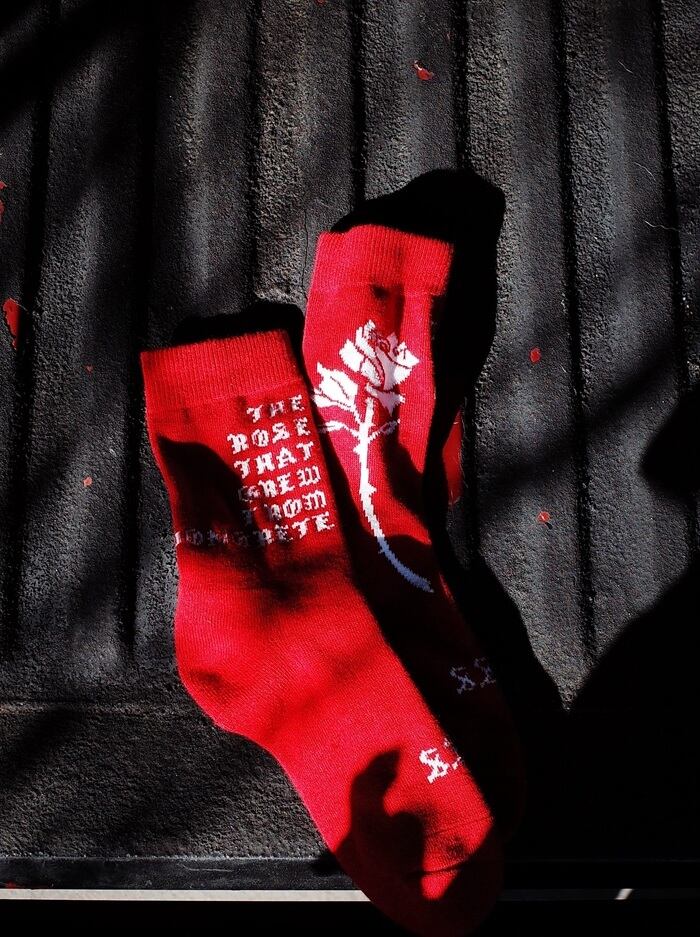 ローカットスニーカー着用時に、パンツの裾がふと捲れた際に 靴に薔薇を挿しているように見えるバランスでデザインしました。